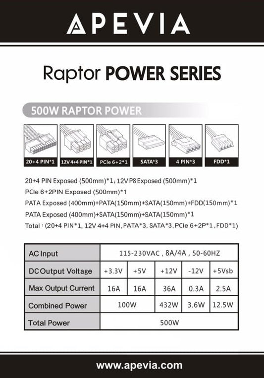 Apevia RAPTOR500W Raptor 500W ATX Power Supply with 120MM Black Fan