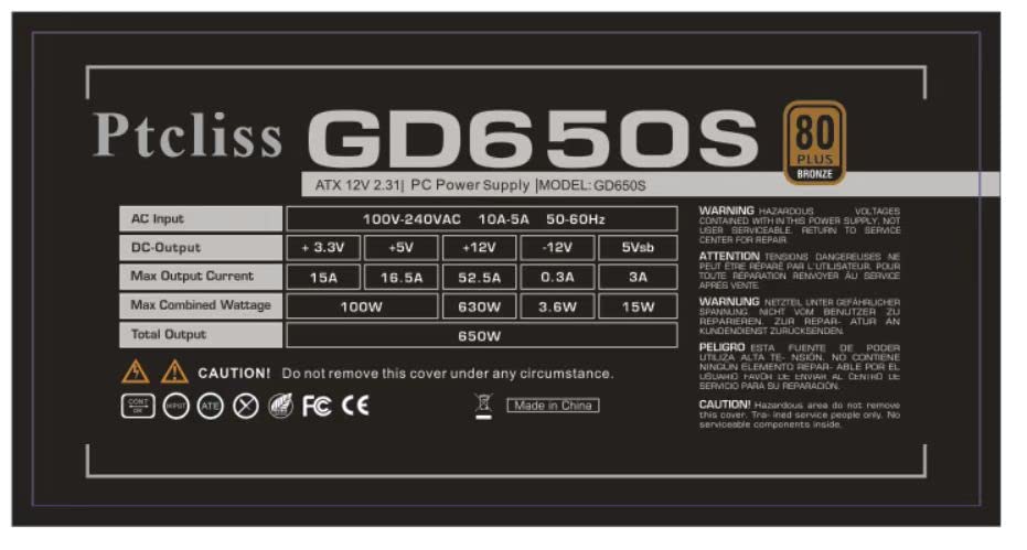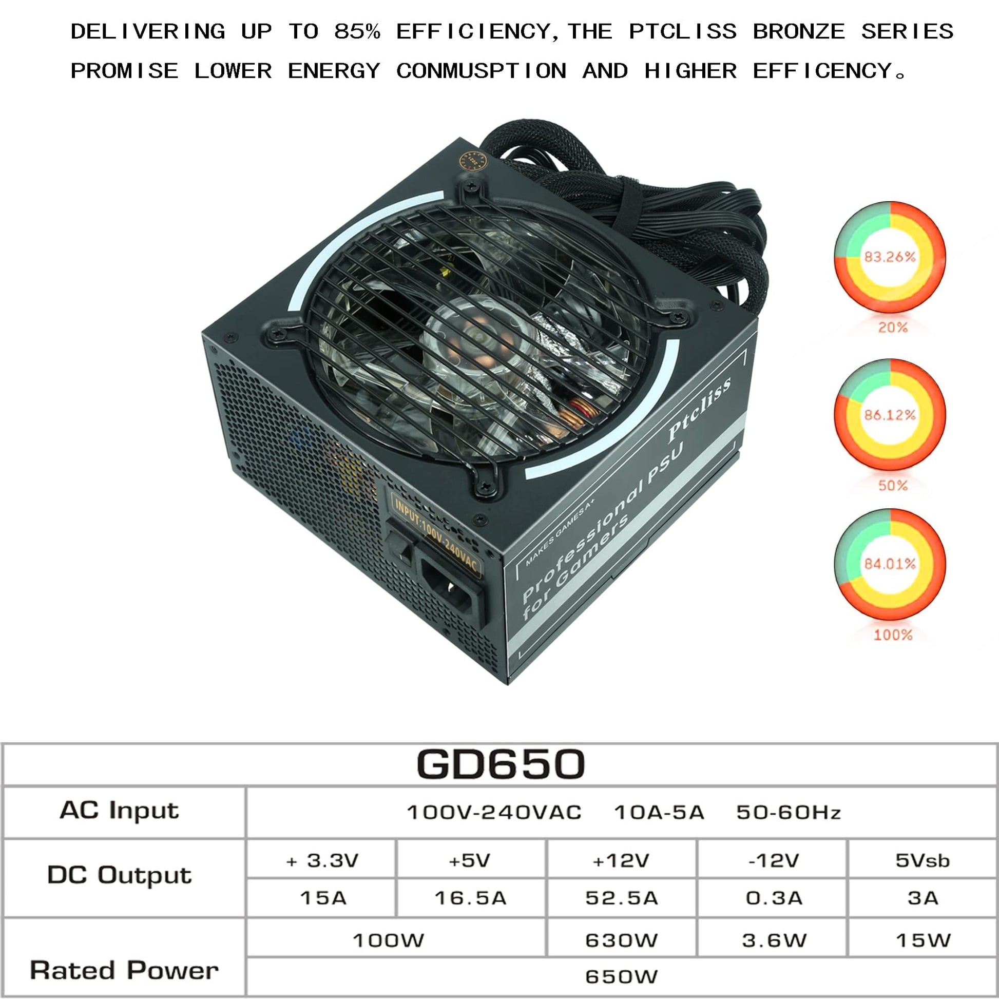 Details: Ptcliss 650W GD650S ATX Gaming PC Power Supply 80+ Bronze PSU Non-Modular Power Supply Flat Black Cables RGB LED Fan