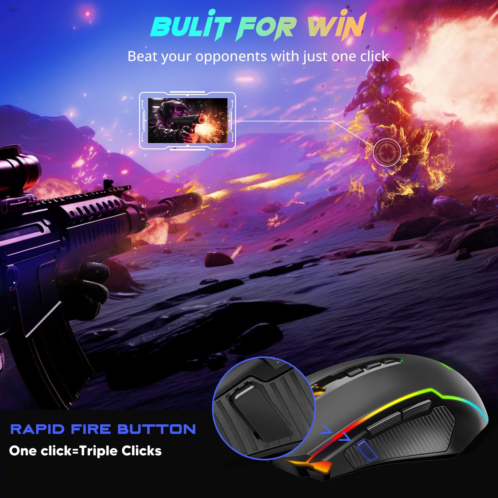 - ⚡️【Born For Victory】 Never miss a gaming mouse that adopts Rapid Fire button ((1 Click=Triple Clicks) while you are gaming, it helps you beat your opponents quickly with just one click.