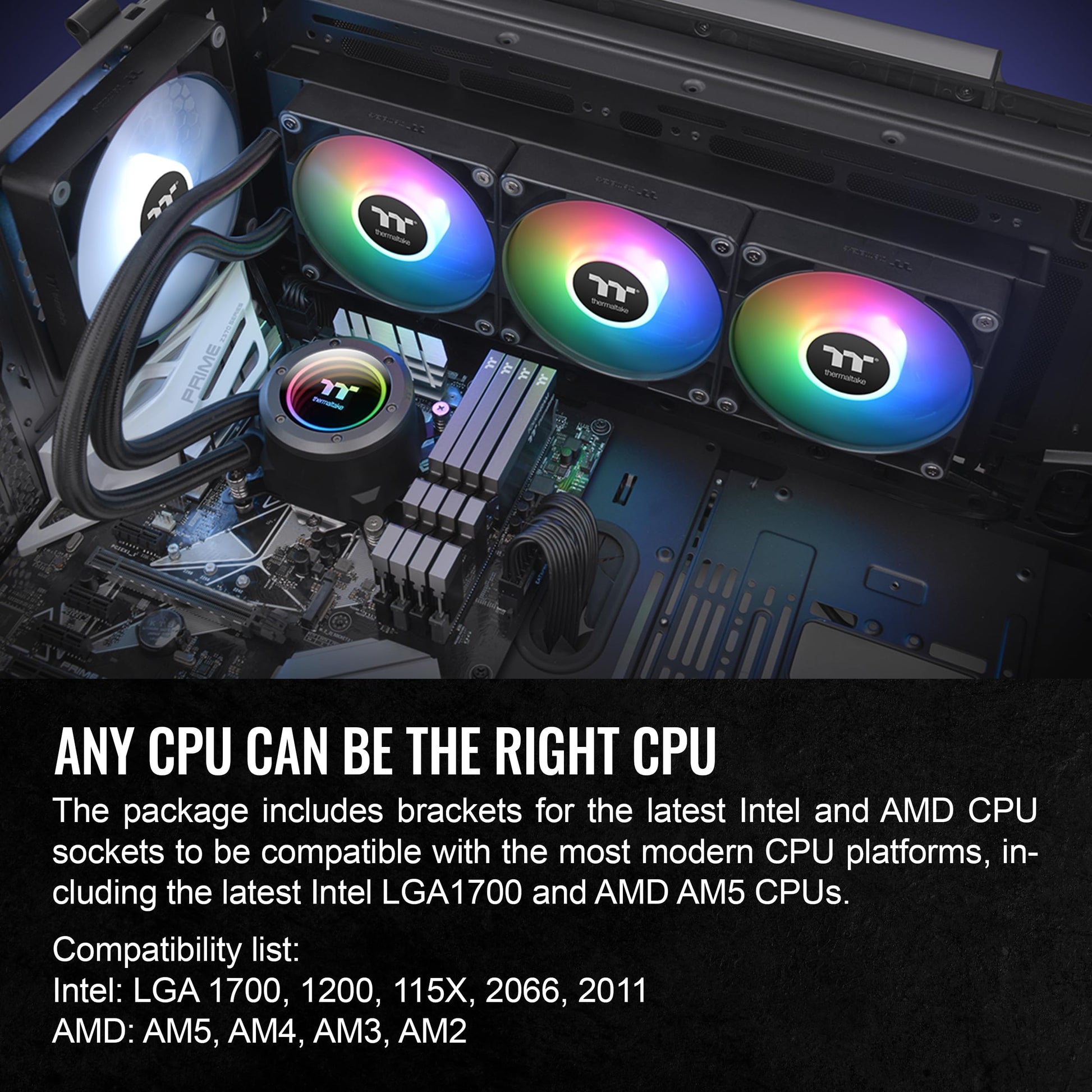 Details: From the all-new TH V2 ARGB Series, the TH360 V2 ARGB has a new industrial cap with an infinity mirror light design, bringing a new vibe to the TH series. Adding Infinity Mirror Lighting to this series can bring more diverse visual effects to the build and gives more depth than it looks. Equipped with three CT120 ARGB fans, you can match them up with some of our chassis’ pre-installed fans and unify your fans with your build! TH360 V2 ARGB has a 27mm slim radiator with a thickened 20mm copper chamber, guaranteeing excellent cooling performance. It is suitable for medium to large chassis that can fit 360mm AIOs and for those who seek to control AIO lighting effects through 5V motherboard-controlled software. •P/N: CL-W362-PL12SW-A •PUMP Speed : PWM 1500~3300 R.P.M ; Rated Voltage : 12 V & 5V ; Rated Current : 0.43 A & 0.32 A ; Power Input : 5.16 W & 1.6 W ; Connector : 2510–4 Pin / 5V ARGB header–3 Pin •WATER BLOCK: Material: Copper •FAN: Dimension: 120 x 120 x 25 mm ; Speed : PWM 500~1800 R.P.M ; Noise Level : 34.7 dB-A ; Rated Voltage : 12 V & 5V ; Rated Current : 0.11 A & 0.31 A (one fan) ; Power Input : 1.32 W & 1.55 W (one fan) ; Max. Air Flow : 57.05 CFM ; Max. Static Pressure : 2.23 mm-H2O ; Connector : 2510 - 4 Pin PWM , 5V ARGB header - 3 Pin ; Bearing Type : Hydraulic Bearing ; Life expectation : 40,000 hrs,25℃ •TUBE: Length : 460 mm ; Material : Rubber •RADIATOR: Dimension : 396 x 120 x 27 mm ; Material : Aluminum •COMPATIBILITY: Intel LGA 1700/1200/1156/1155/1151/1150 ; AMD AM5/AM4/AM3+/AM3/AM2+/AM2