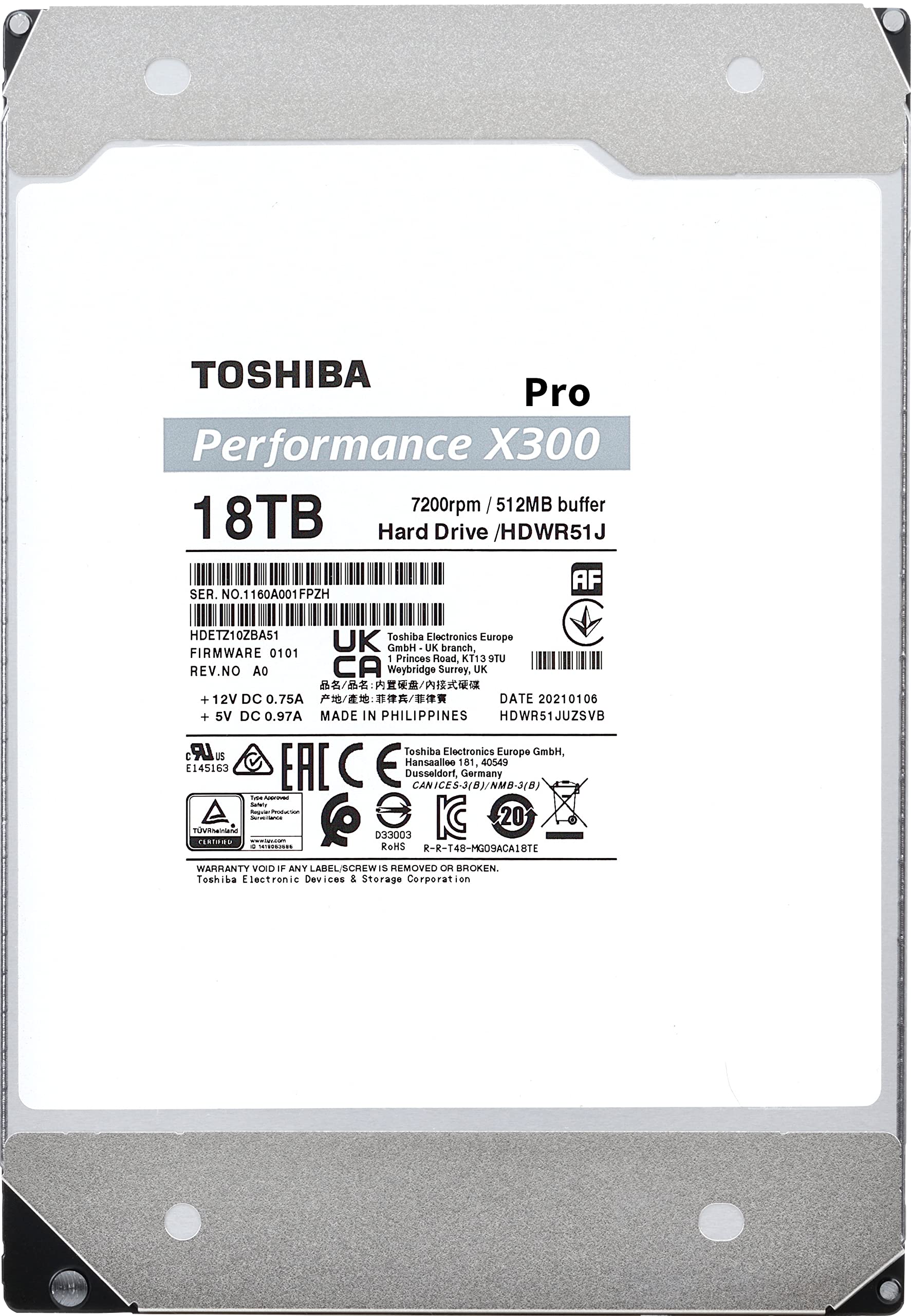Toshiba X300 PRO 18TB High Workload Performance for Creative Professionals 3.5-Inch Internal Hard Drive – Up to 300 TB/Year Workload Rate CMR SATA 6 GB/s 7200 RPM 512 MB Cache - HDWR51JXZSTB